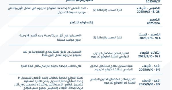The Acting Dean of Admission and Registration at Kuwait University, Dr. Fadel Abbas Aziz, announced that registration, withdrawal, and add/drop for the first semester of the..