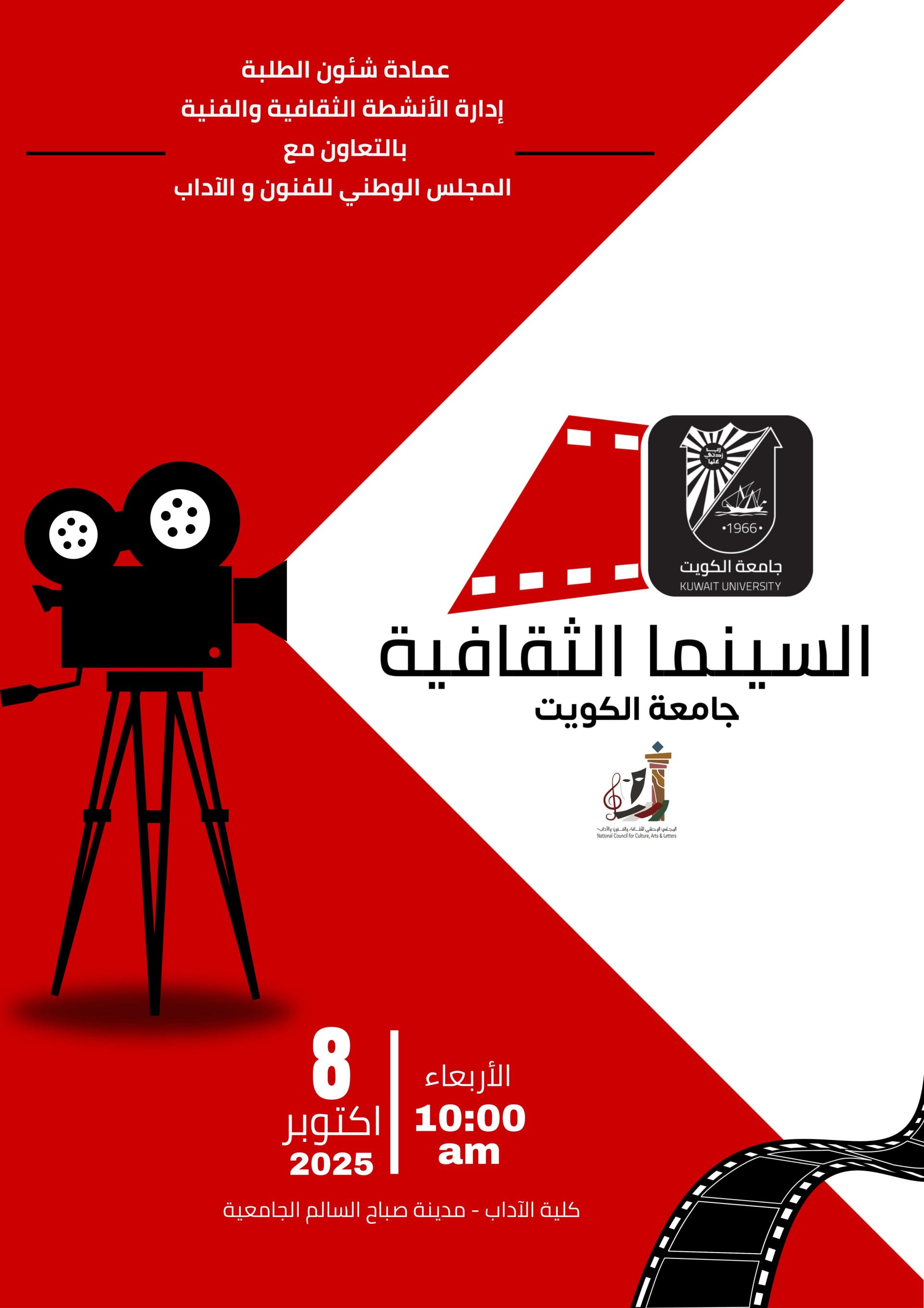 أعلنت عمادة شئون الطلبة بجامعة الكويت عن إطلاق مبادرة “السينماالثقافية” لأول مرة، وذلك بالتعاون مع المجلس الوطني للثقافة والفنون والآداب،في خطوة تهدف إلى تعزيز الوعي الثقافي والفني لدى الطلبة وإثراء الحياةالجامعية بالأنشطة النوعية.