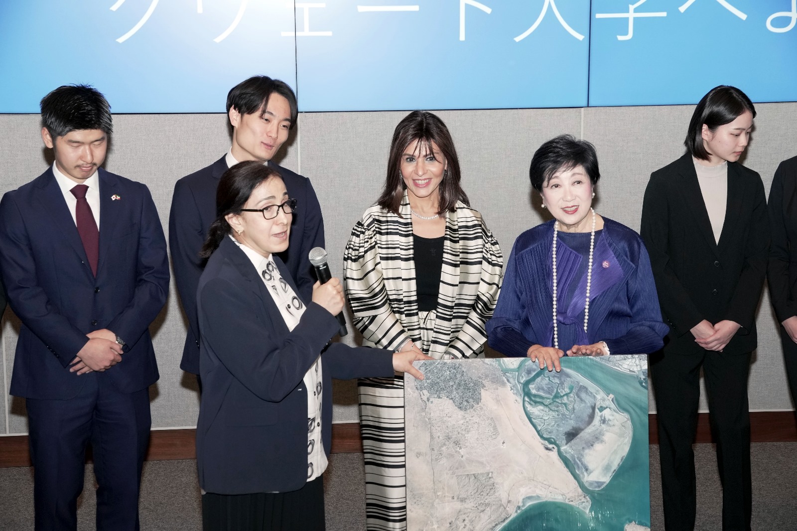 وفي الختام، قدّمت جامعة الكويت هدية تذكارية إلى حاكمة طوكيو تمثّلت في صورة لأول لقطة التقطها القمر الاصطناعي “كويت سات1” الذي طوّره فريق من جامعة الكويت، تقديراً لزيارتها ودعمها للمبادرات البيئية والابتكارات العلمية.