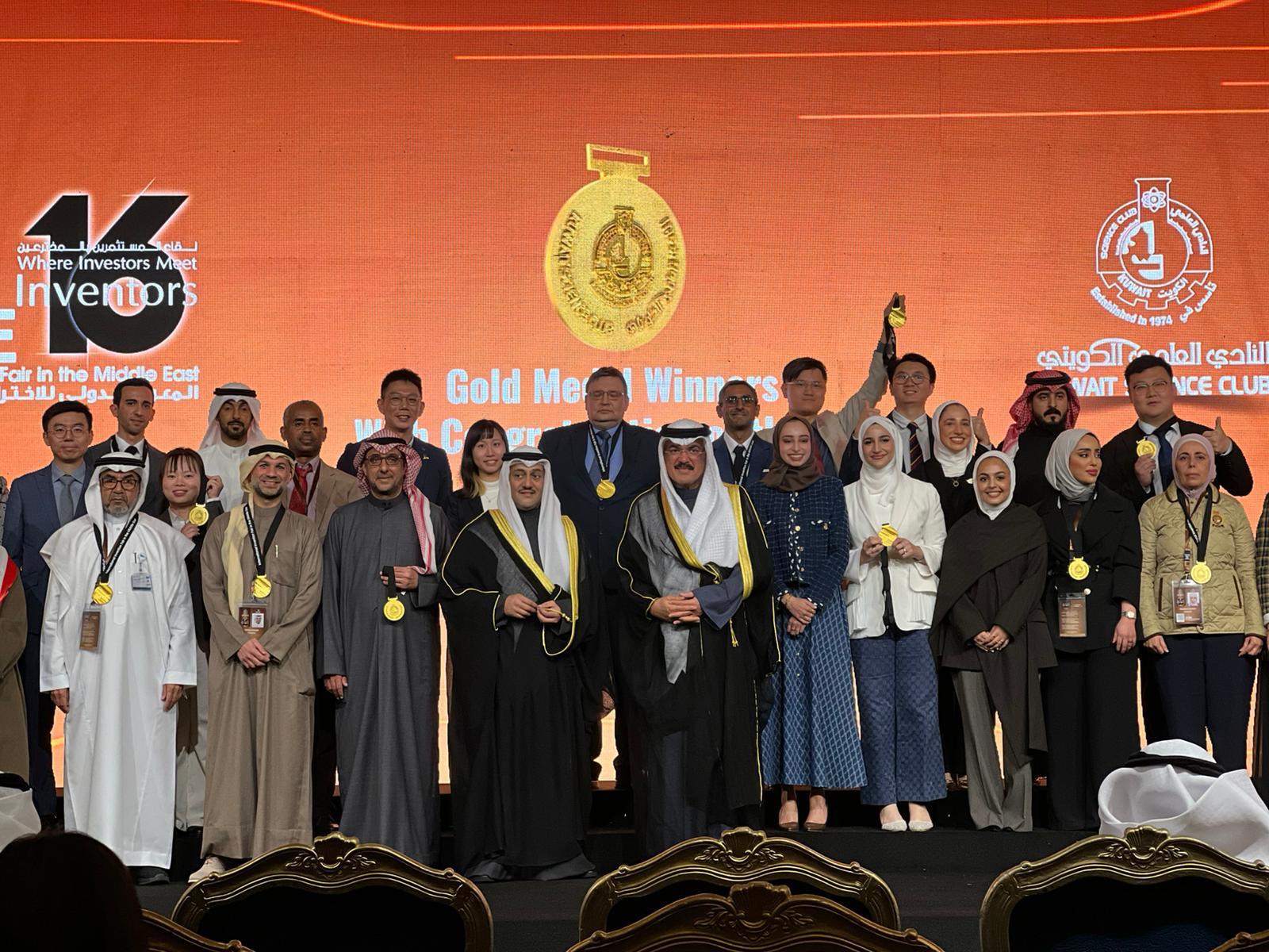 وحصل الدكتور محمد عبد اللطيف الفارس من قسم الهندسة الميكانيكية بكلية الهندسة والبترول، مع فريقه البحثي المشكل من المهندسات: شيخة الخلفان، صفاء كرم، رباب فردان، وزينب خالد، على الميدالية الذهبية مع مرتبة الشرف عن اختراعهم: