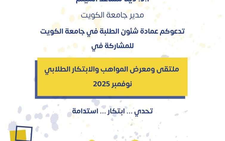 تحت رعاية مدير جامعة الكويت أ. د. دينا مساعد الميلم، تنظم عمادة شؤون الطلبة ملتقى ومعرض المواهب والابتكار الطلابي تحت شعار “تحدي – ابتكار – استدامة”، وذلك في كلية الآداب بمدينة صباح السالم الجامعية، خلال الفترة من 18 إلى 19 نوفمبر 2025.