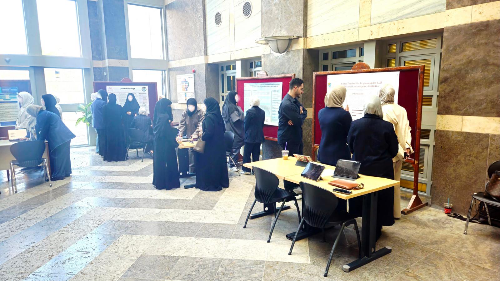 في إطار حرص كلية الصيدلة على تعزيز دور الصيدلي في خدمة المجتمع والارتقاء بمستوى الرعاية الصحية، نظم مقرر (تعزيز الصحة 3) عرضاً لملصقات علمية أعدها طلبة المقرر، استعرضوا من خلالها مشاريع مبتكرة تسلط الضوء على الخدمات التي يمكن أن يقدمها الصيدلي لزيادة فعالية المهنة وتحسين صحة المريض، وذلك بحضور أعضاء هيئة التدريس د. مي الحزامي، ود. أسماء الحقان، ود. زهراء الصيرفي ود. أحمد تقي.