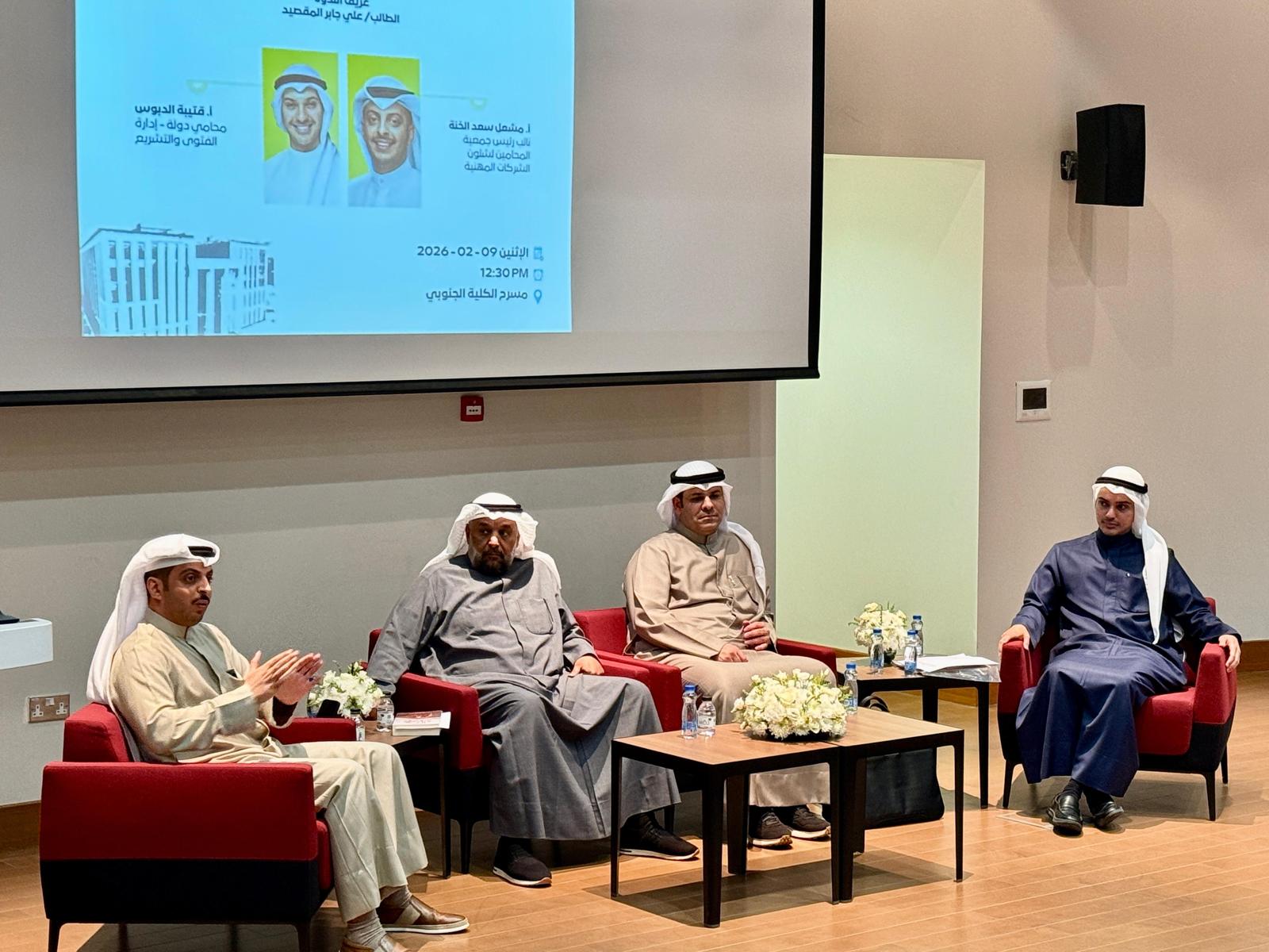 وشارك في الندوة كل من عضو هيئة التدريس بقسم القانون الخاص الدكتور محمد المطيري، ومدير مركز التدريب التخصصي بالإدارة العامة للتحقيقات الدكتور إبراهيم الشرقاوي، ومحامي الدولة بإدارة الفتوى والتشريع الأستاذ قتيبة الدبوس، ونائب رئيس جمعية المحامين لشئون الشركات المهنية الأستاذ مشعل الخنة.
