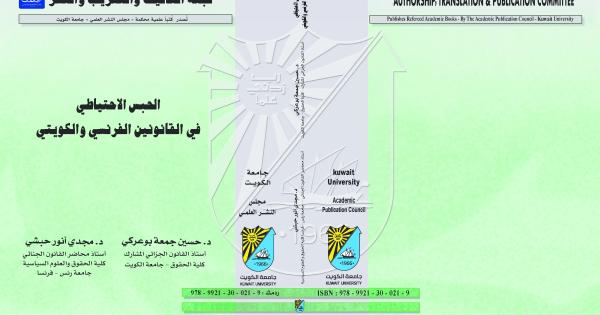صدر حديثاً عن لجنة التأليف والتعريب والنشر التابع لمجلس النشر العلمي - جامعة الكويت الكتاب الموسوم بـ : الحبس الاحتياطي في القانونين الفرنسي والكويتي . من تأليف د. حسين جمعه بوعركي..